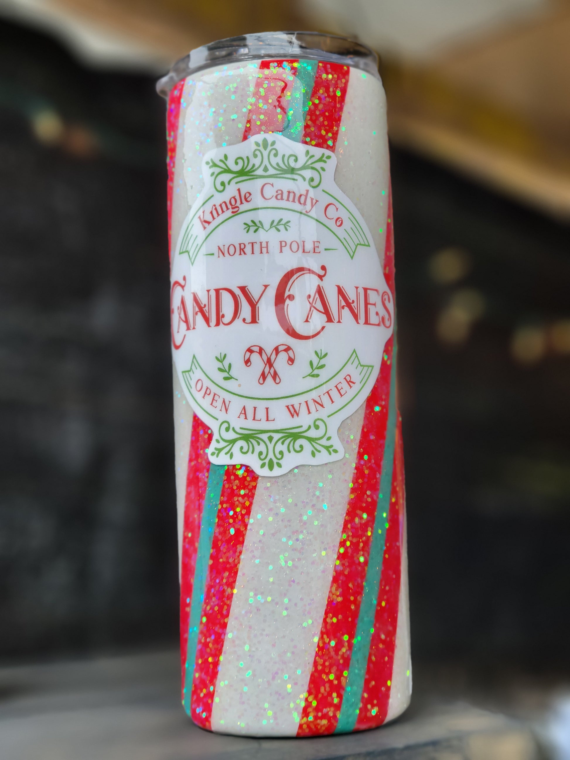 This glittery candy cane tumbler is the perfect vessel to hold your hot or cold holiday libations.