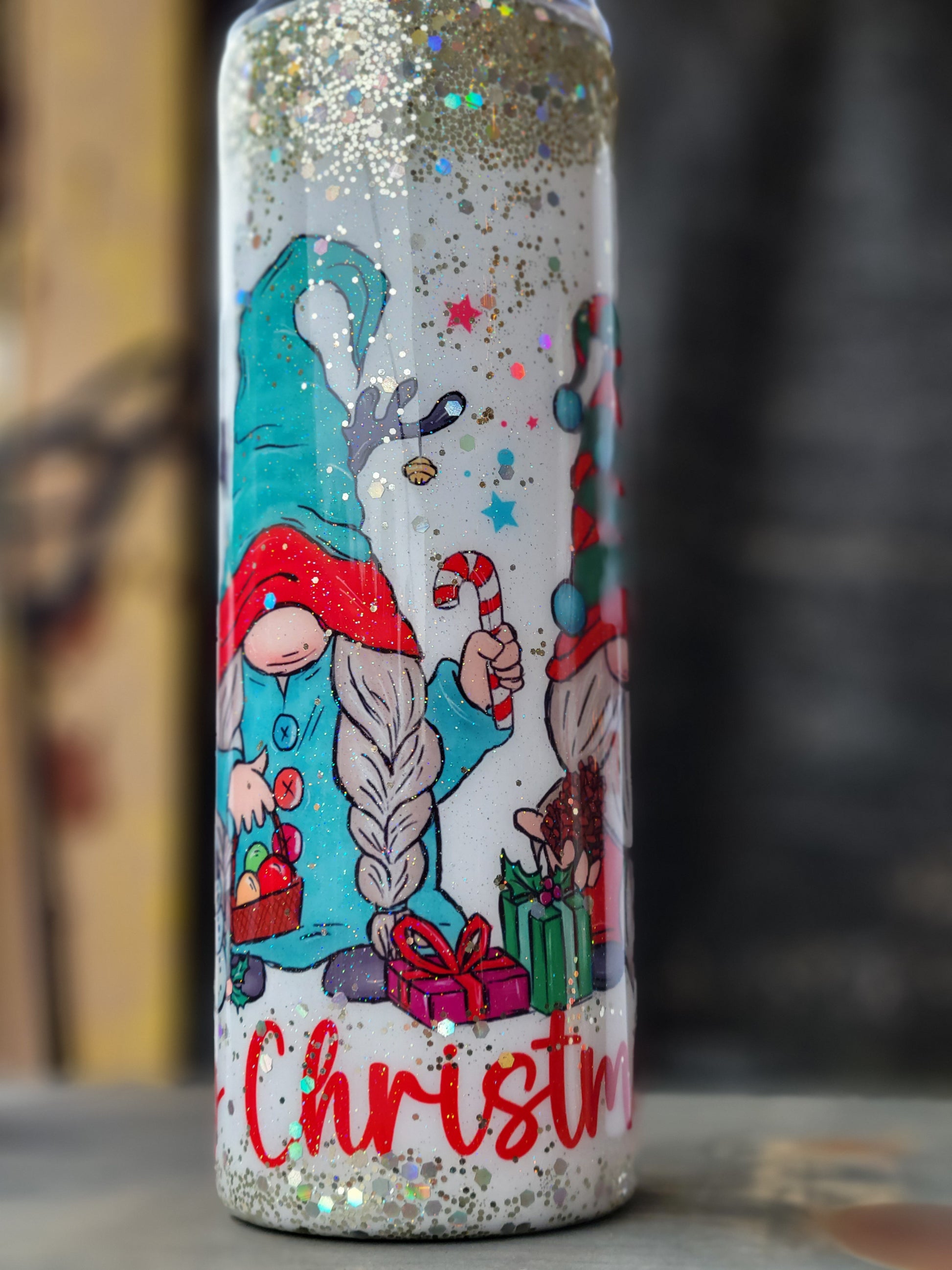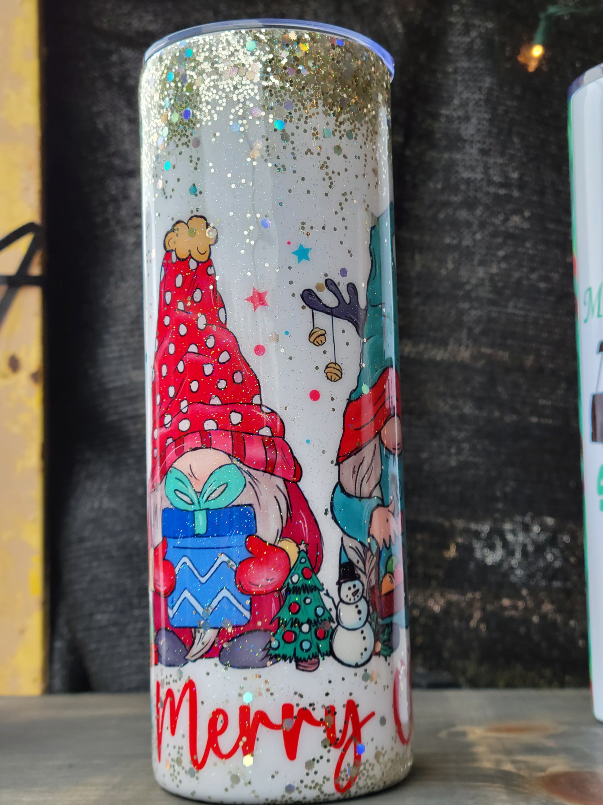 Adorned with silver glitter and festive gnomes, this is the perfect tumbler to hold your sippable holiday cheer!