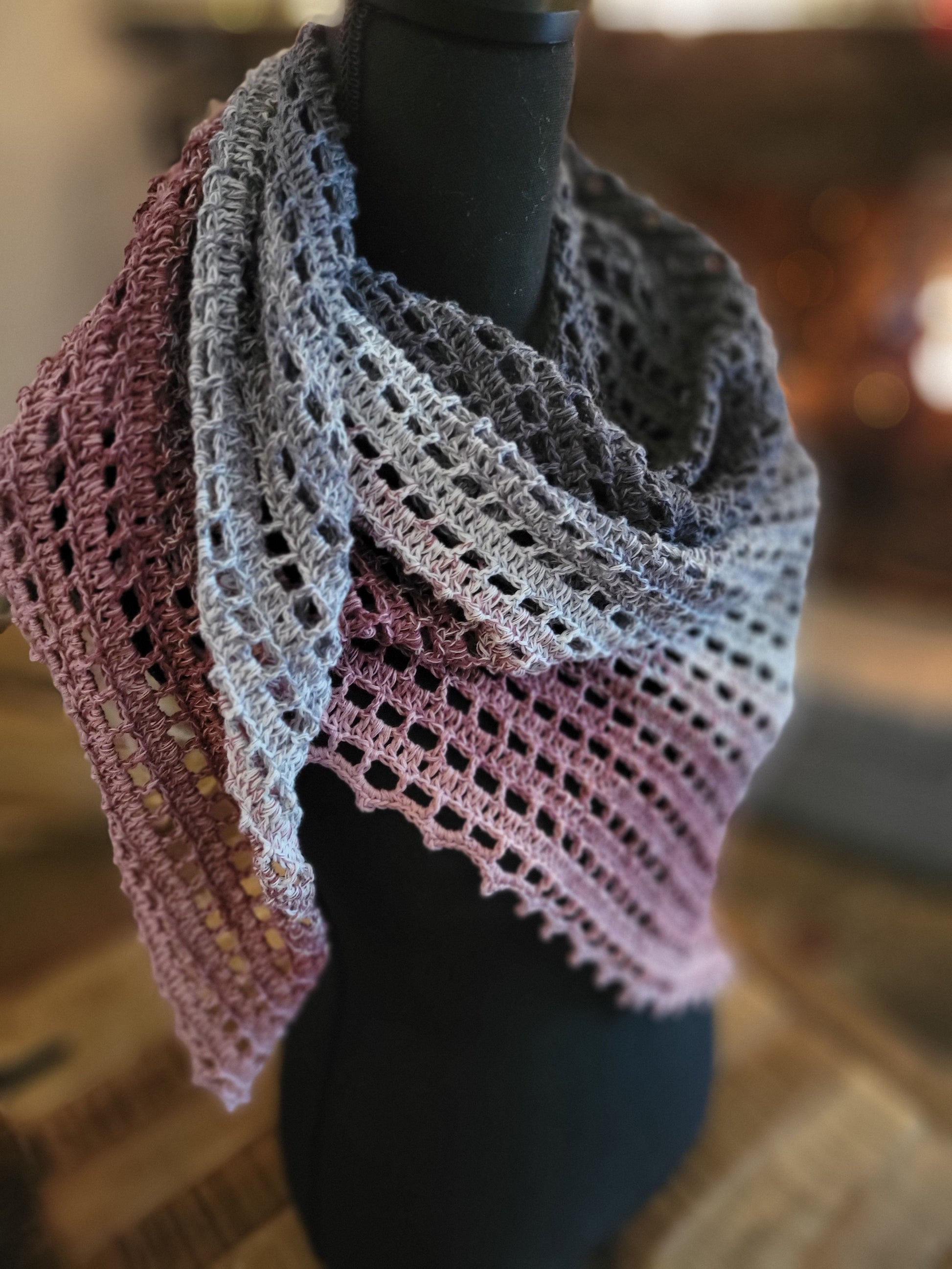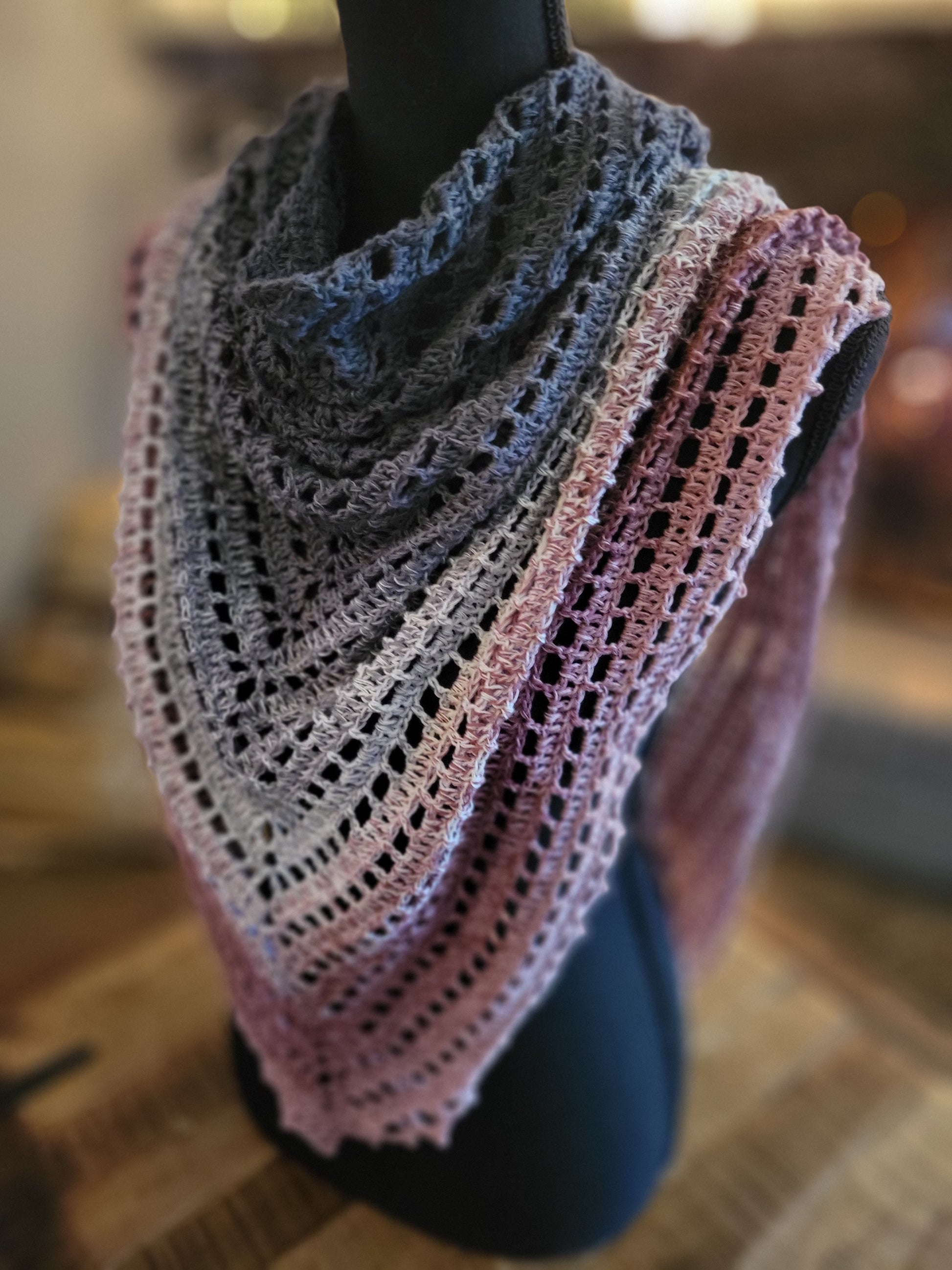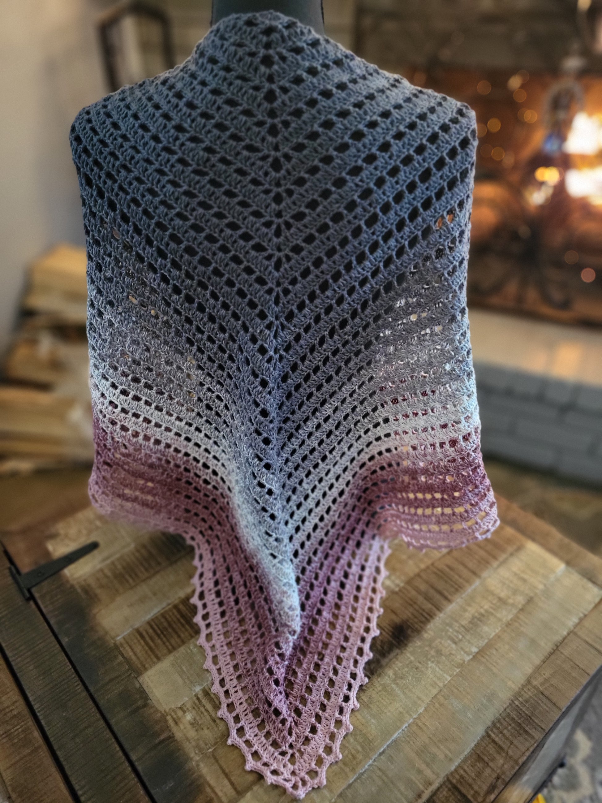 This triangular shawl features a beautiful filet pattern and is perfect for a breezy spring evening. The colors transition from a light blush pink to a deep gray. Made with 100% cotton fibers, this shawl is machine washable with cool water and should be dried flat.