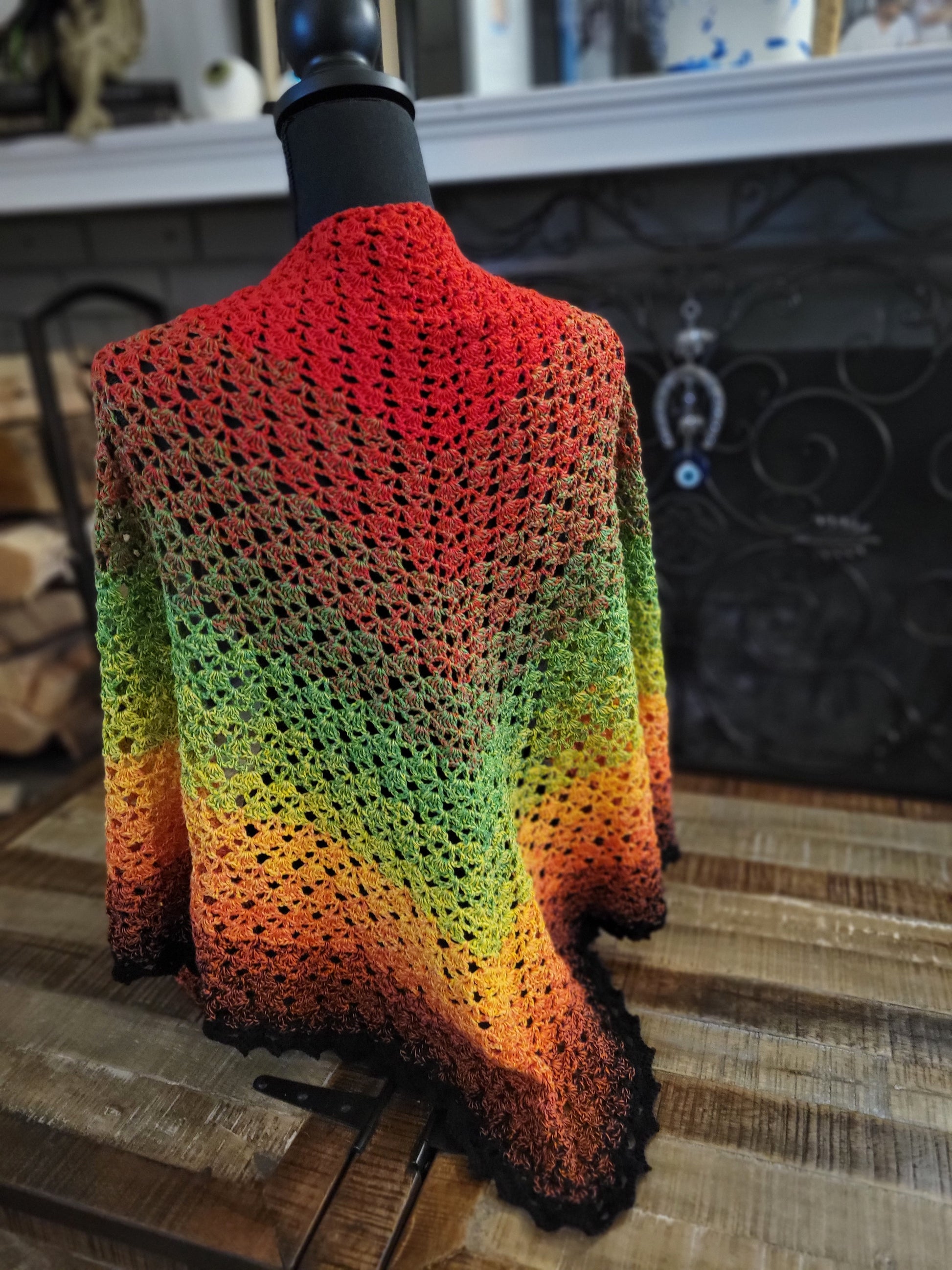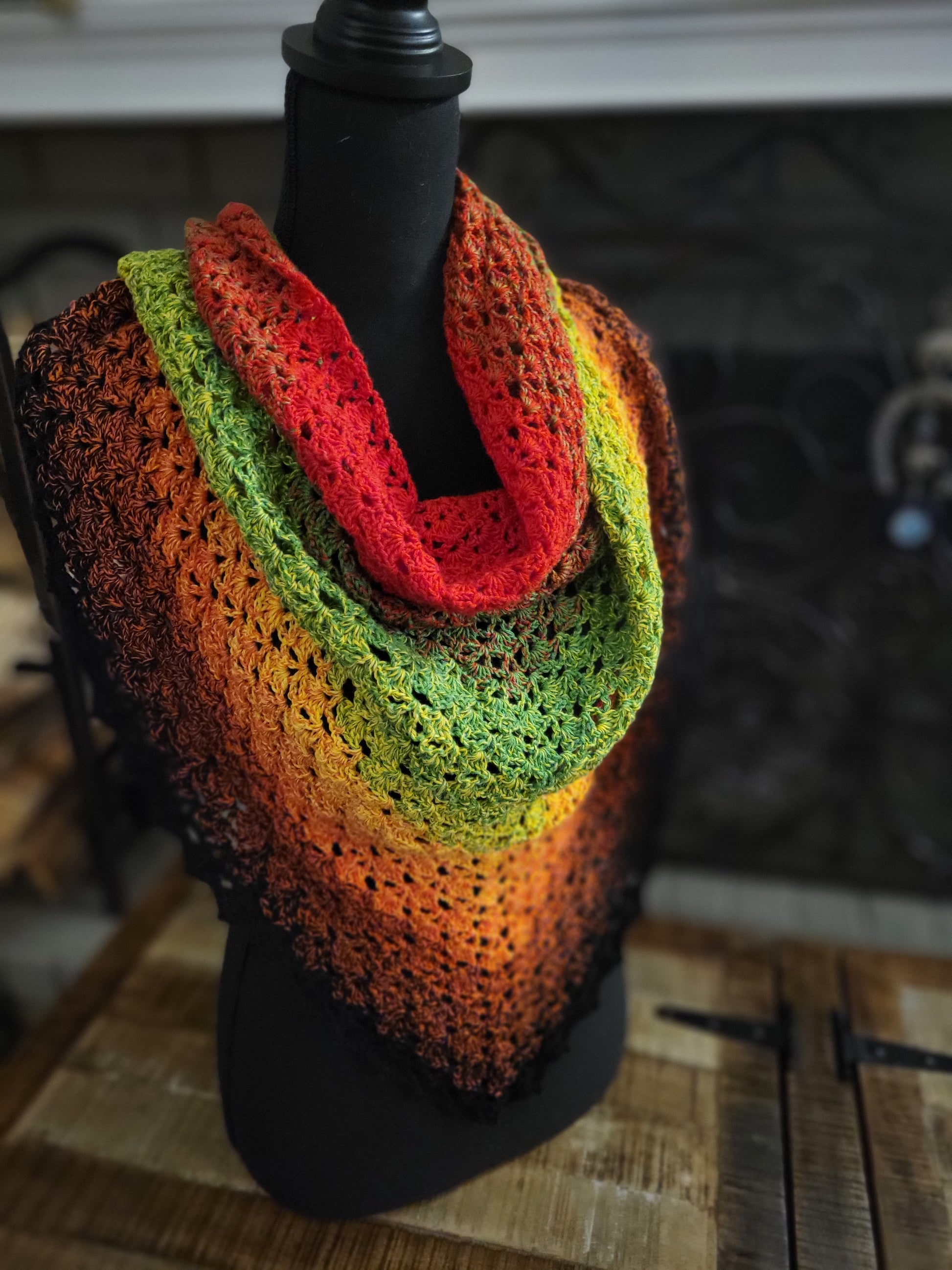 This triangular shawl features a beautiful shell pattern and is perfect for a breezy fall evening. The colors transition from red, to green, to yellow, to orange, and finally to black. Made with cotton and acrylic fibers, this shawl is machine washable with warm water and should be dried flat.
