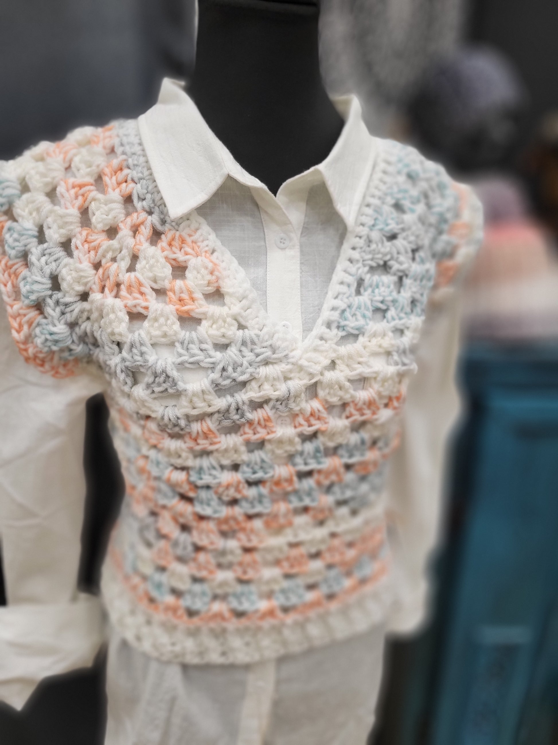 This beautiful crocheted sweater features a v-neck and cap sleeves. Made with light and airy acrylic fibers, this top is machine washable with cold water and can be dried on a low setting.