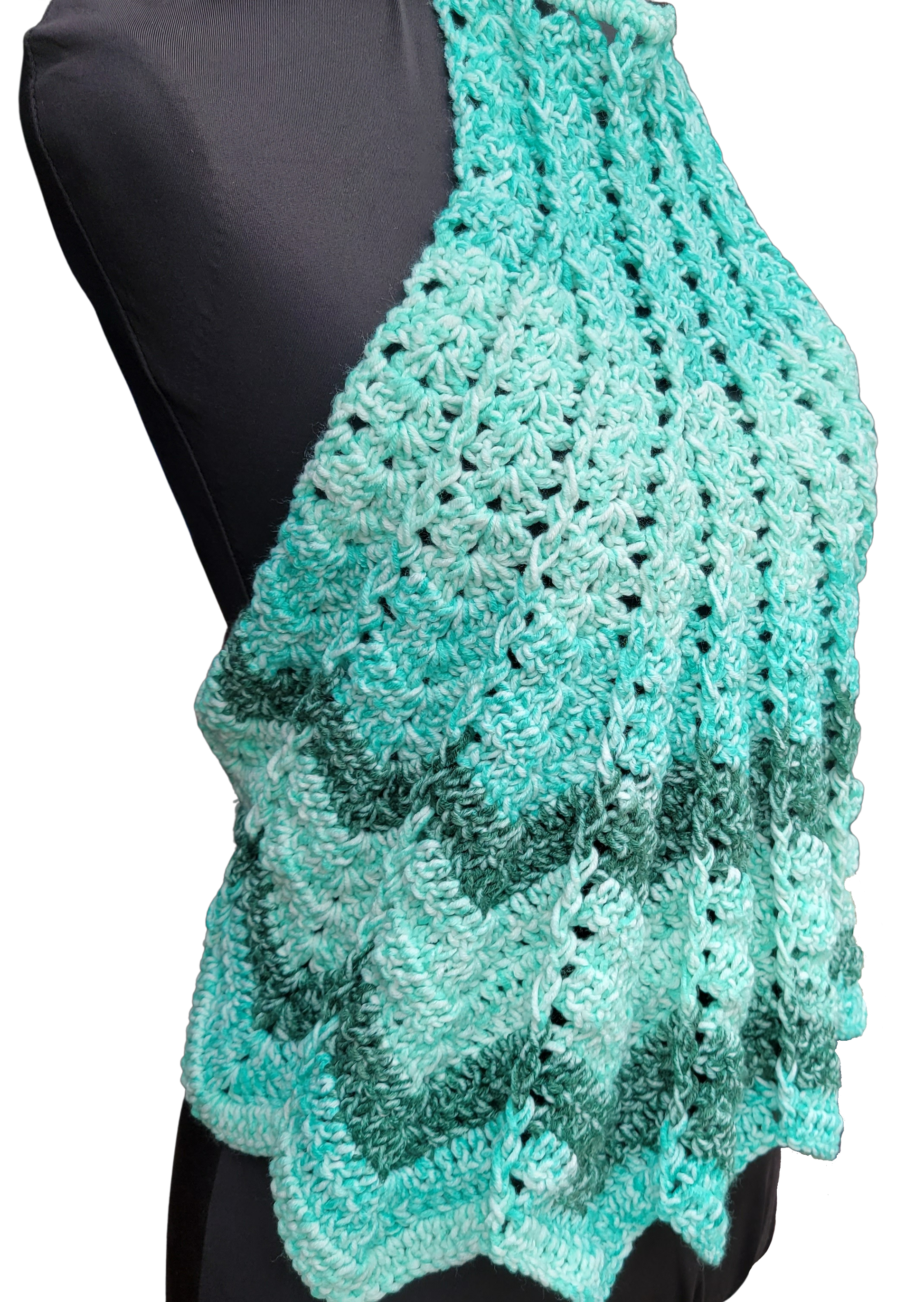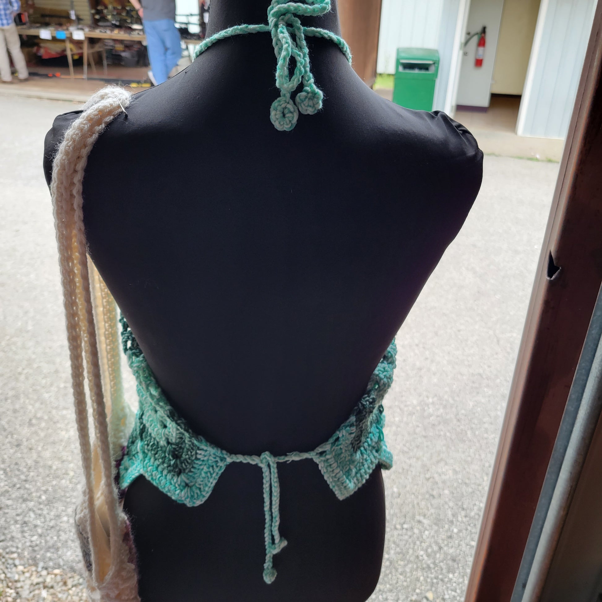 This flowy crocheted halter top features a high neckline and scalloped hem with two tie closures in the back. Made with light and airy acrylic fibers, this top is machine washable with warm water and can be dried on a low setting.