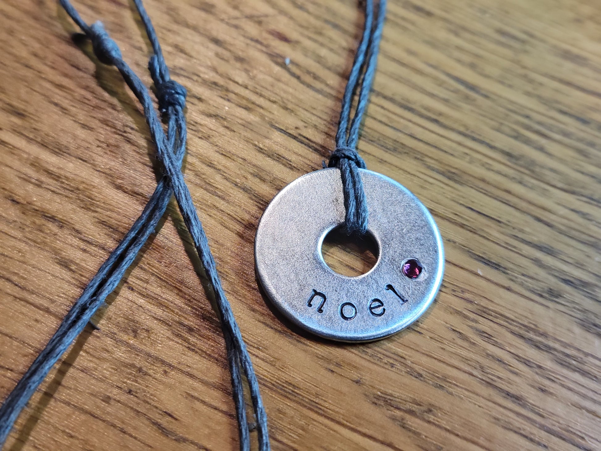 These unique industrial jewelry pieces are hand-made to order per your specifications. The example shown is made with a zinc washer, stamped with lowercase typewriter font, and includes a crystal birthstone.