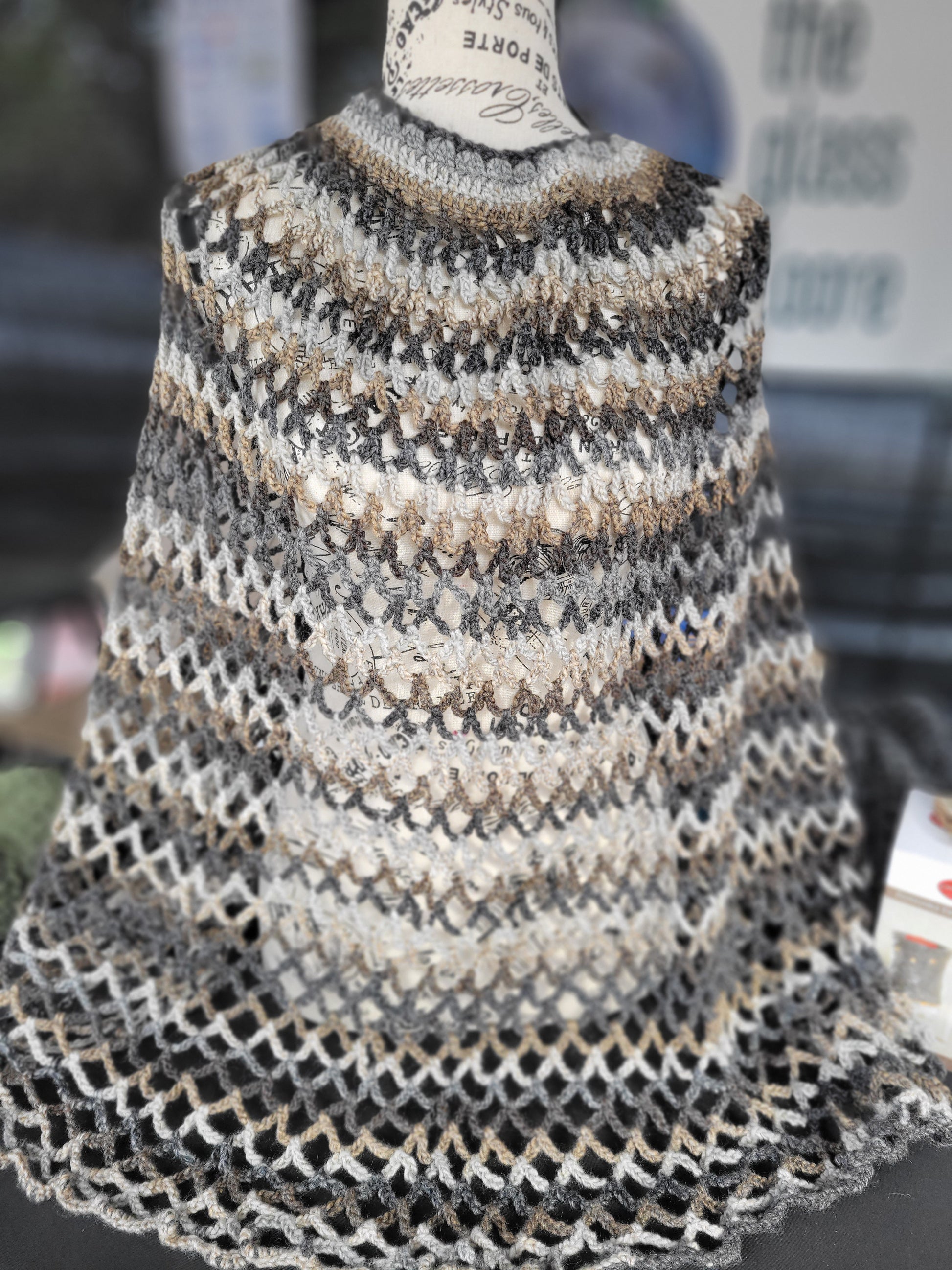 This is a light and airy all-season poncho crocheted in creamy brown tones.
