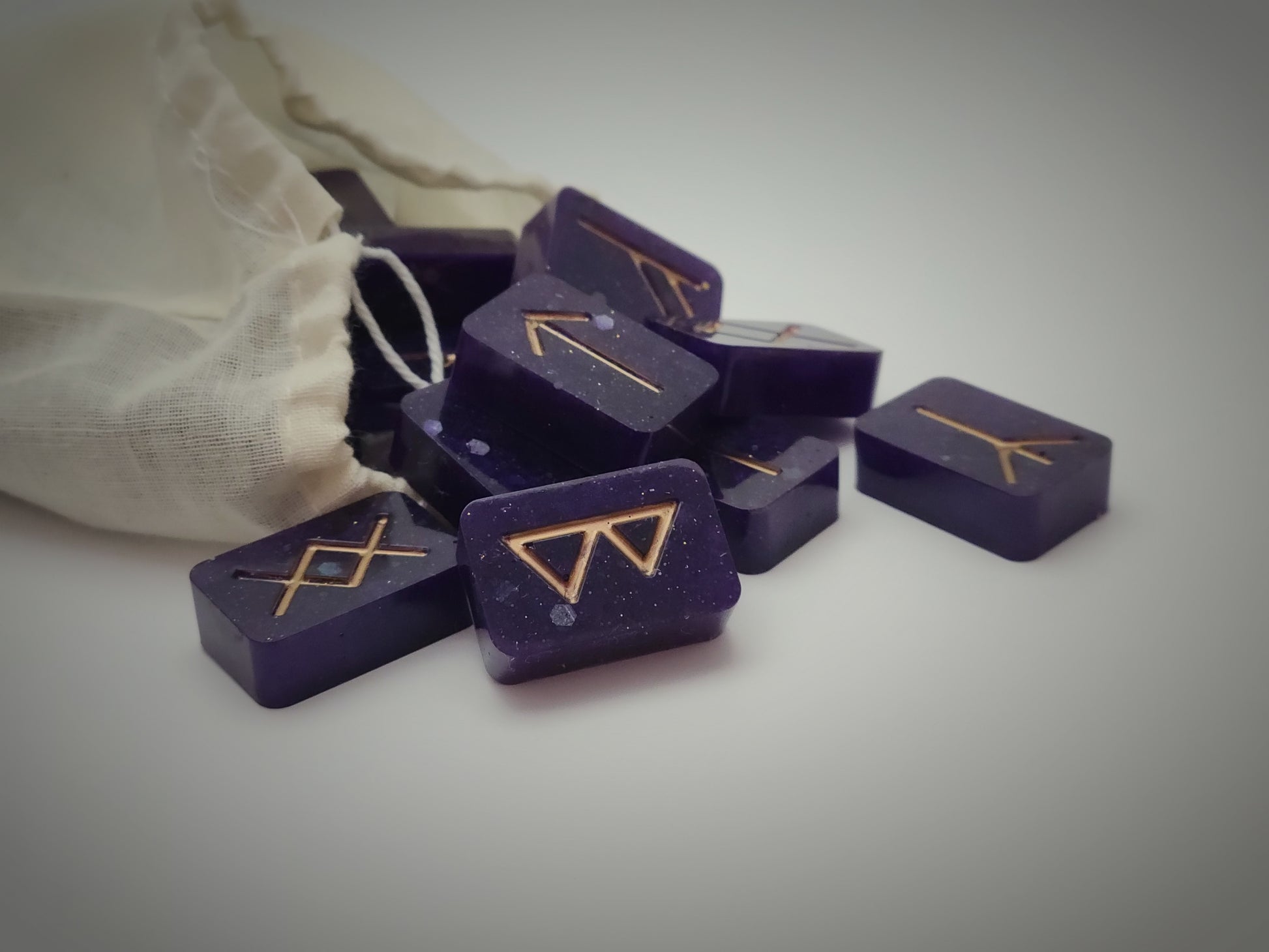 27 Piece Rune Stones in Dark Violet and Gold with Carrying Bag