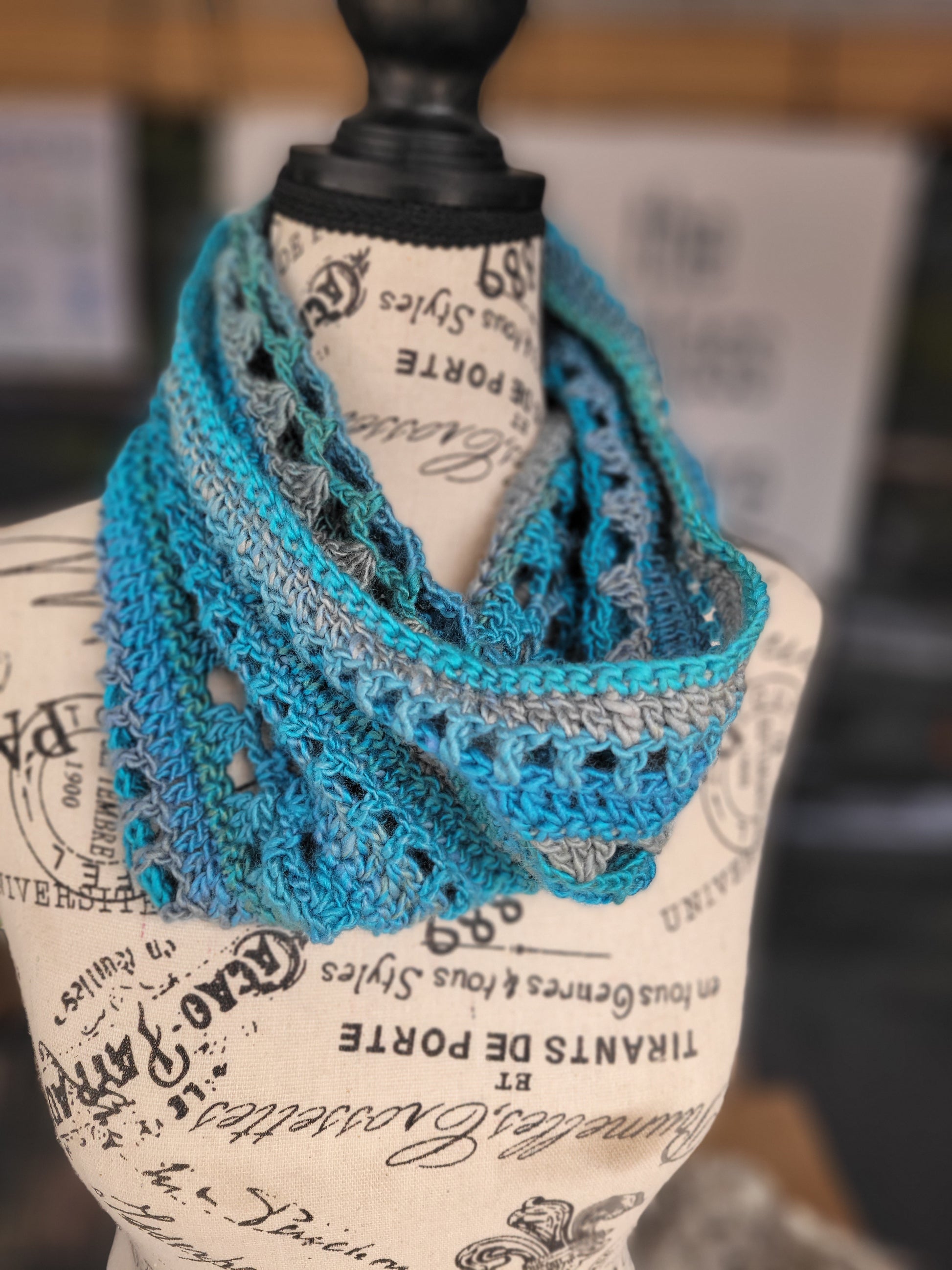 This is a light and airy all-season cowl crocheted in a mix of cool aqua tones.